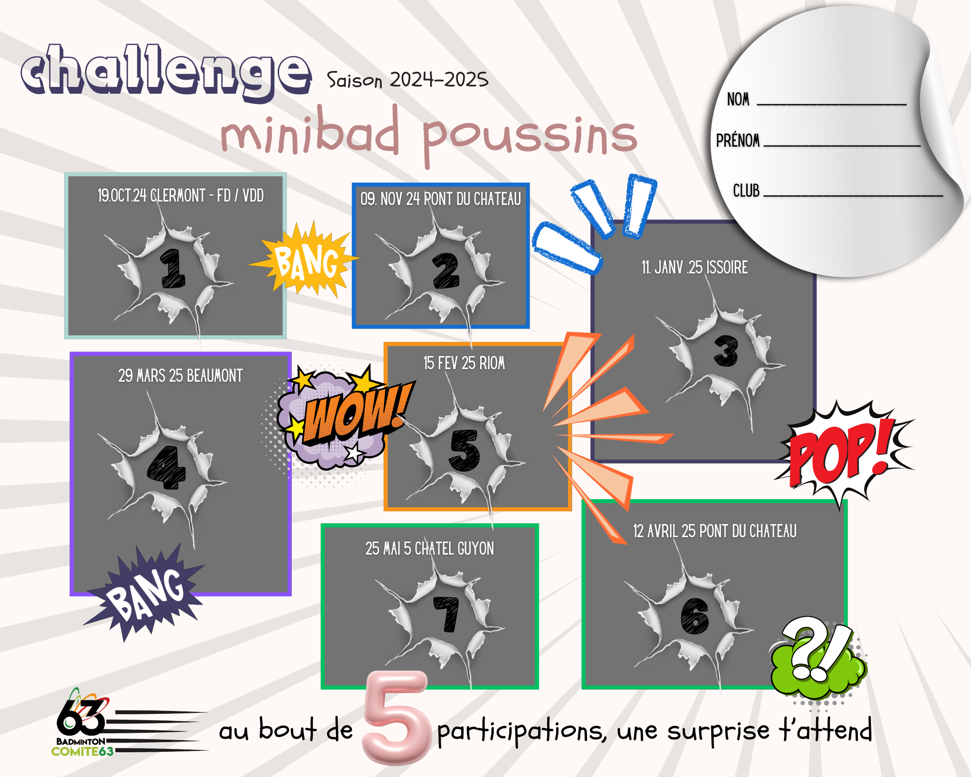 Objectif : rassembler un maximum de minibad et poussin 1ère année pour une matinée conviviale, quel que soit leur niveau.
