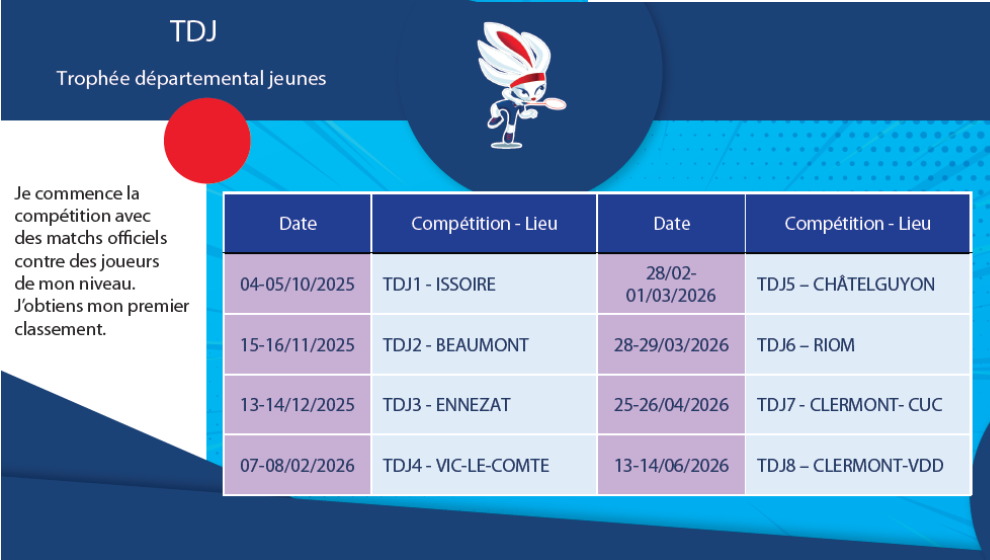 Au cours de la saison 8 TDJ seront organisés, ces compétitions sont ouvertes aux poussins, benjamins, minimes, cadets et juniors et permettent aux jeunes de se mesurer aux autres joueurs et joueuses de leur niveau.